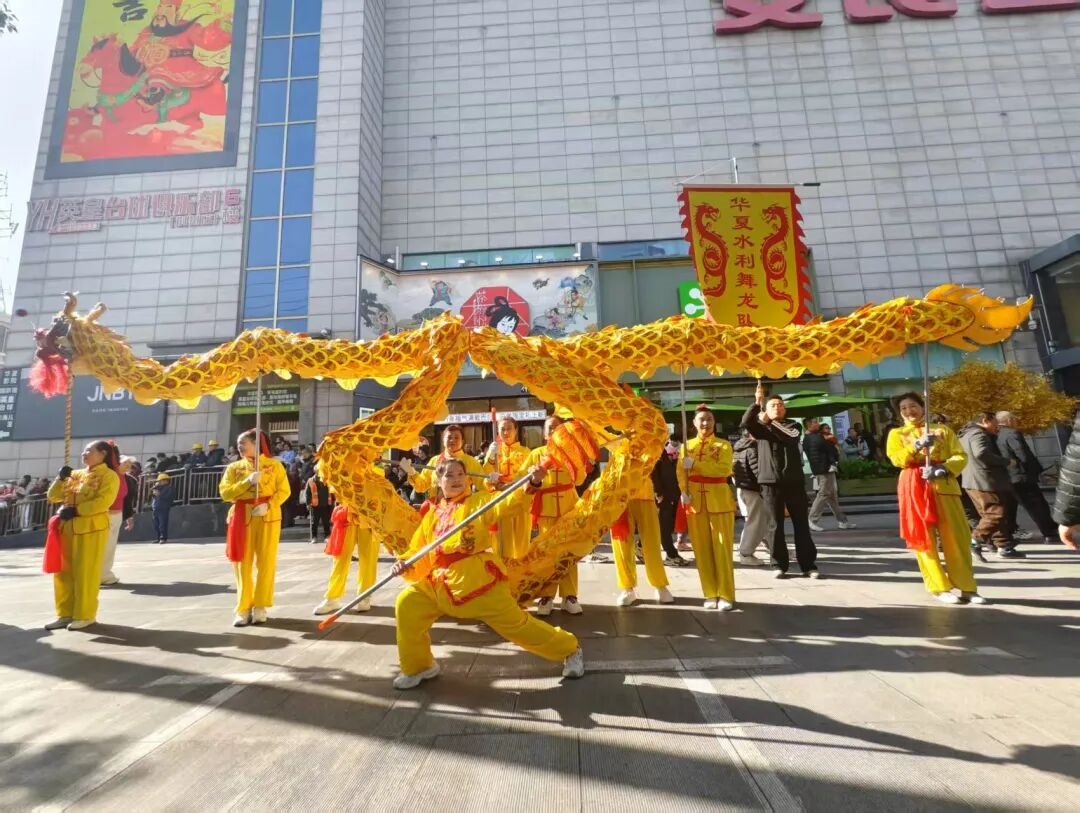 湖北華夏水利受邀組建并冠名的舞龍隊精彩參演。活動現場,公司舞龍隊隊員們配合默契,巨龍騰躍翻飛,精彩的表演贏得了現場觀眾的連連喝彩,成為民俗活動中的一道亮眼風景線。
